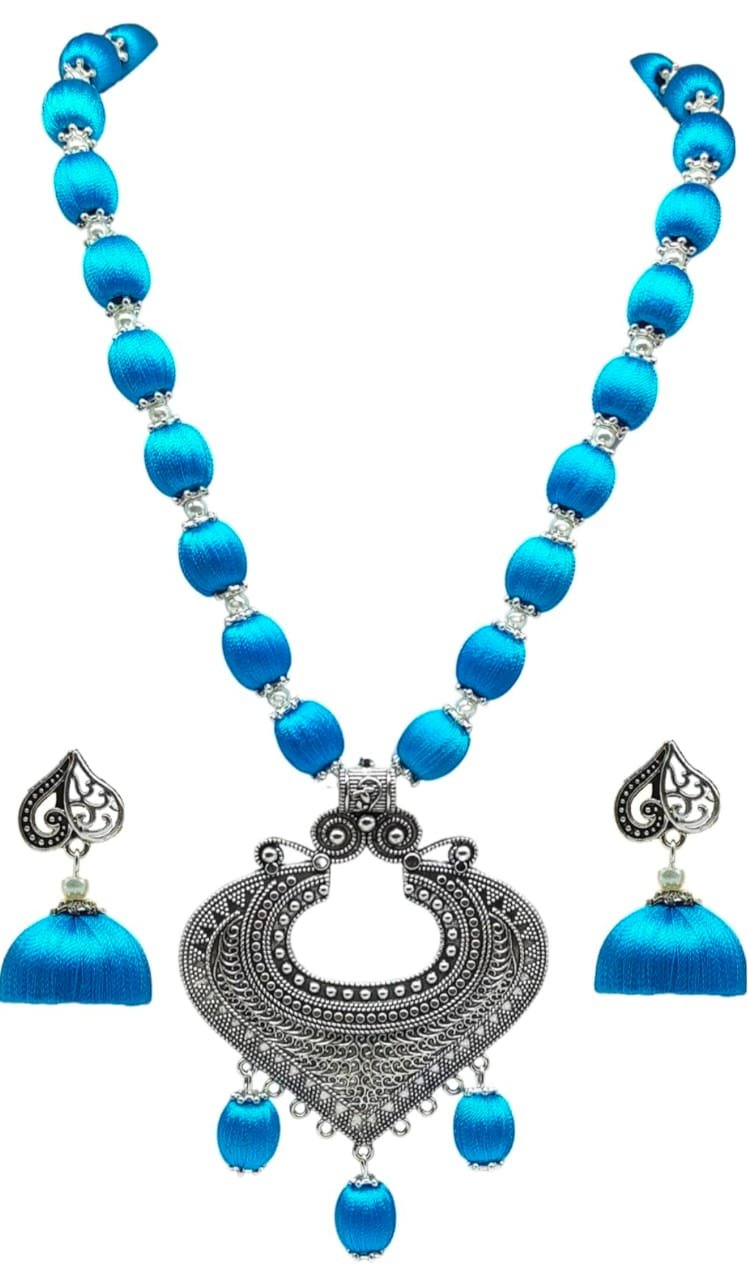 Elevate your style with our exquisite silk thread necklace, now available in an array of enchanting colors including Peacock Blue, Magenta, Green, Peacock Green, Light Rose and etc. Paired with an ANTIQUE DOLLAR and a stunning earring set, this necklace features 22 colored silk thread beads. The accompanying JHUMKA EARRING set boasts a 23mm base diameter with a design perfectly complementing the necklace